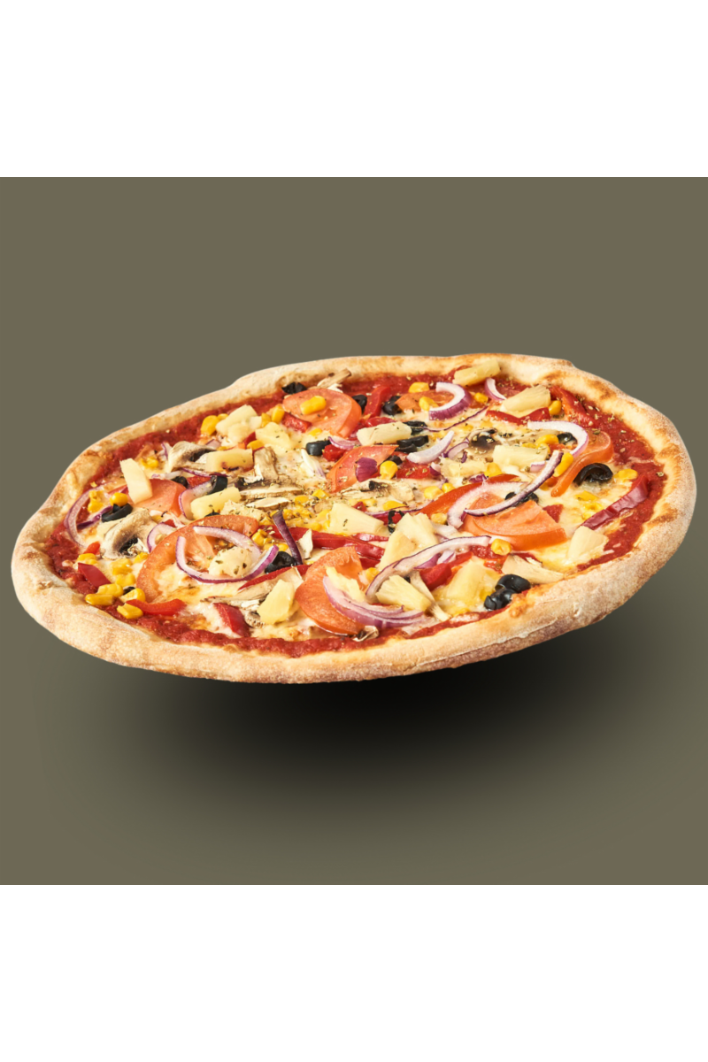 Mozzarella, mais, tomat, løk, ananas, oliven, paprika og champignon