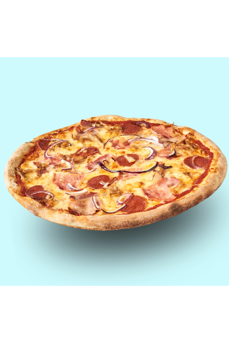 Mozzarella, pepperoni, bacon, skinke, kylling og løk